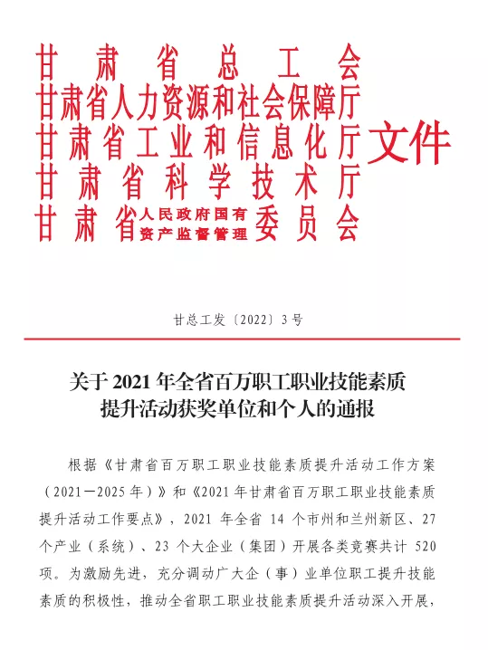 1月21日,甘肅省總工會、省人力資源和社會保障廳、省工業和信息化廳、省科學技術廳、省人民政府國有資產監督管理委員會聯合公布了《關于2021年全省百萬職工職業技能素質提升活動獲獎單位和個人的通報》,石化集團專精特新公司孫占棟、劉恒、林占強、駱振璽、劉恒5名職工榮獲“2021年甘肅省技術標兵”稱號。