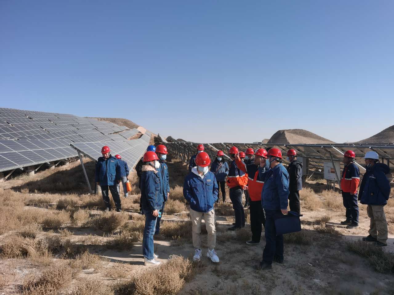 專精特新公司首先向蘭州供電公司和新區(qū)供電公司匯報該項目建設(shè)情況及目前手續(xù)辦理情況,并就相關(guān)問題做出解答。隨后,帶領(lǐng)蘭州供電公司及新區(qū)供電公司一行人員前往10MW光伏站場,國網(wǎng)專業(yè)人員對設(shè)備參數(shù)、線路配置、信號傳輸及場站安全等各方面進行了詳細的詢問,并對現(xiàn)場設(shè)備及準(zhǔn)備運行情況進行了全面了解,就后期運行提出了指導(dǎo)意見。