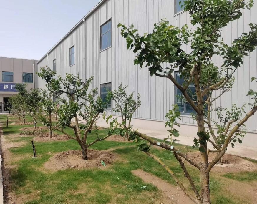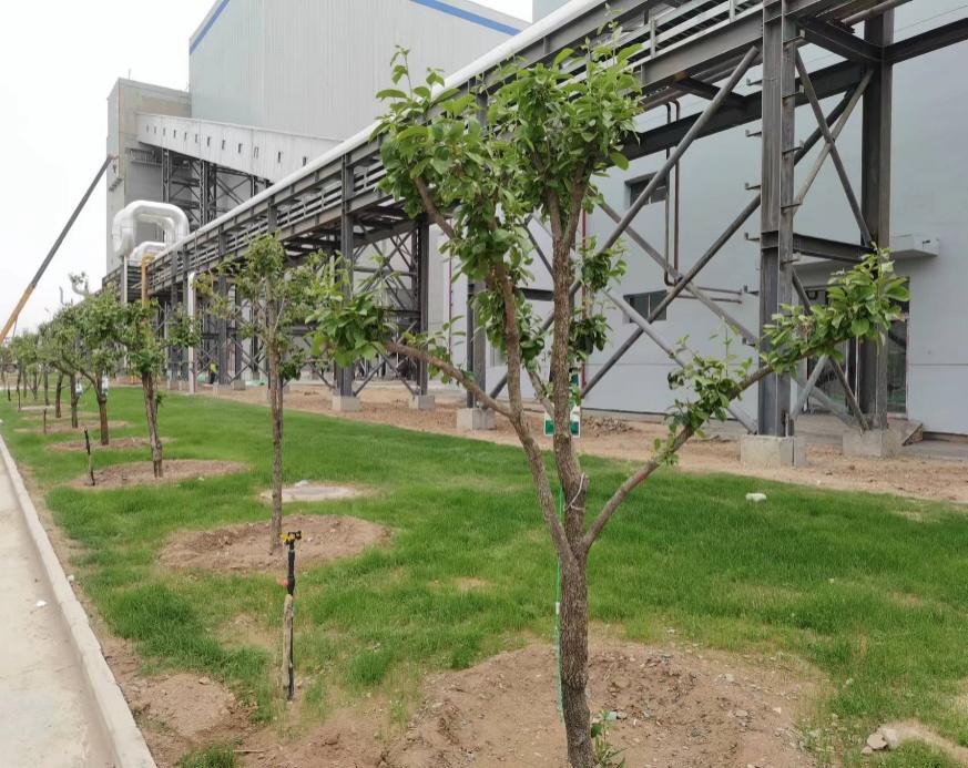 因地制宜,確定綠化方案。公司以“凈化美化環境,改善區域小氣候”為綠化主要原則,按功能區對廠區空地進行不同的綠化布置。在廠區北門口兩側種植9棵梧桐樹,象征著栽桐引鳳之意。廠區主干道路兩側選用高大闊葉喬木樹種,綠化帶內種植草坪,辦公樓兩側栽植四季玫及常青圓柏冬青球組合,廠前區栽植山楂樹,廠區西側栽植山楂樹、杏樹和梨樹。