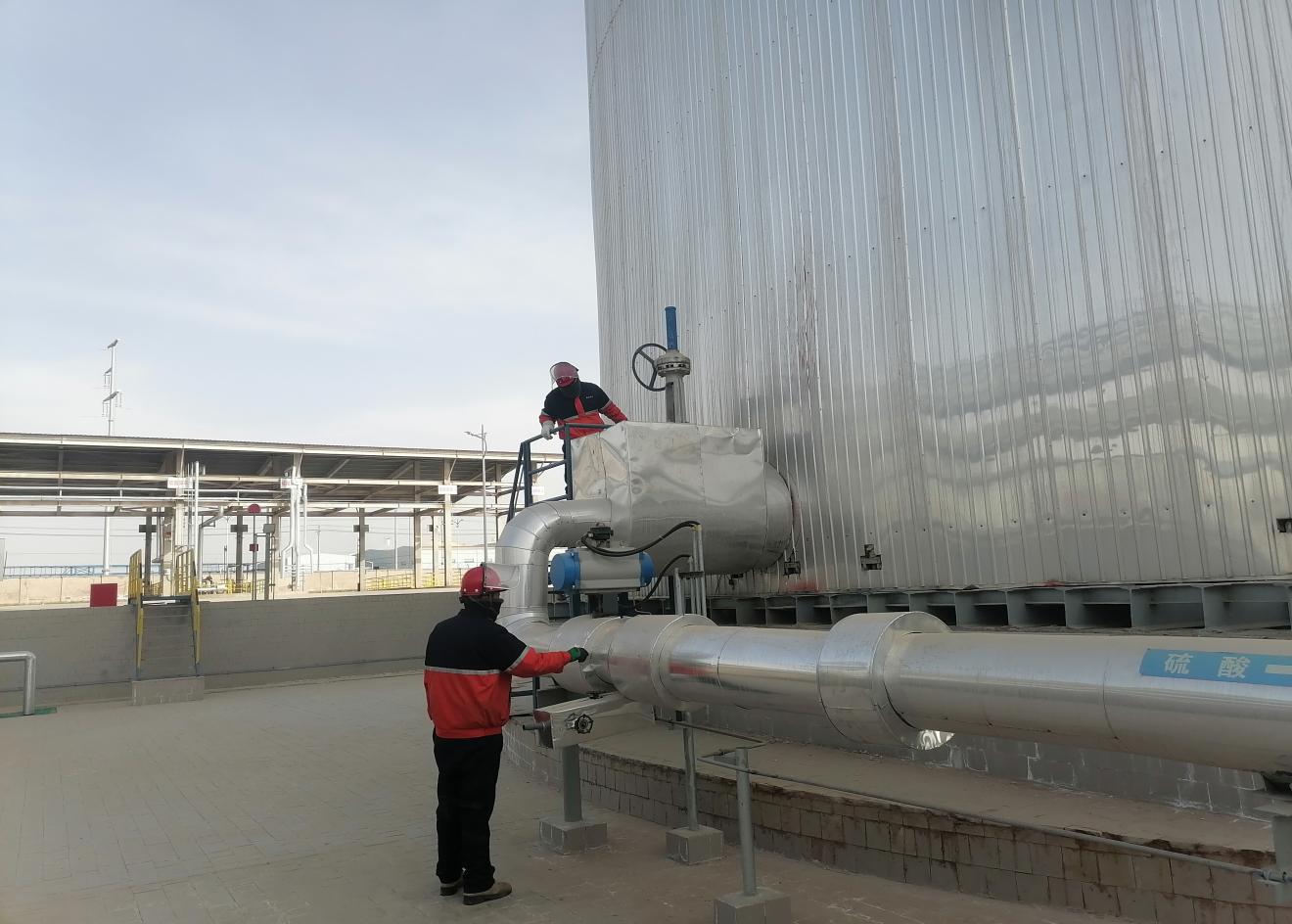 大年初一,接班后班組巡檢人員按照巡檢路線來到了硫酸罐區進行檢查,查看儲罐溫度、壓力、現場管線、閥門的狀態。數九寒天、滴水成冰,但絲毫不影響他們的工作熱情,他們嚴格按照巡檢規程操作,從裝卸棧臺到罐區,從換熱站到倉庫,都留下了他們忙碌的身影。