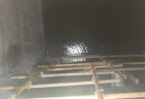 閉水試驗(yàn)是池體施工質(zhì)量總體檢驗(yàn)的必要環(huán)節(jié)之一。為加快推進(jìn)項(xiàng)目建設(shè)進(jìn)度,石投集團(tuán)博石環(huán)保有限公司與施工單位中鐵二十一局積極溝通,明確施工方案,確定實(shí)驗(yàn)日期,要求中鐵二十一局嚴(yán)格按照施工計(jì)劃執(zhí)行,并指定專人負(fù)責(zé),從管道施工、池底平整、腳手架拆除、廢料清除、預(yù)埋管口及進(jìn)出口的臨時(shí)封堵、輸水管道的敷設(shè)等環(huán)節(jié)層層把控,督促中鐵二十一局做好閉水試驗(yàn)前的各項(xiàng)準(zhǔn)備工作。在閉水實(shí)驗(yàn)過程中,博石環(huán)保公司要求中鐵二十一局隨時(shí)對池體進(jìn)行外觀檢查,觀測底板、池壁是否漏水,發(fā)現(xiàn)滲漏點(diǎn)要做好標(biāo)記并及時(shí)處理解決。經(jīng)過連續(xù)三天的持續(xù)觀察和記錄后,若無滲漏才可逐步排水。