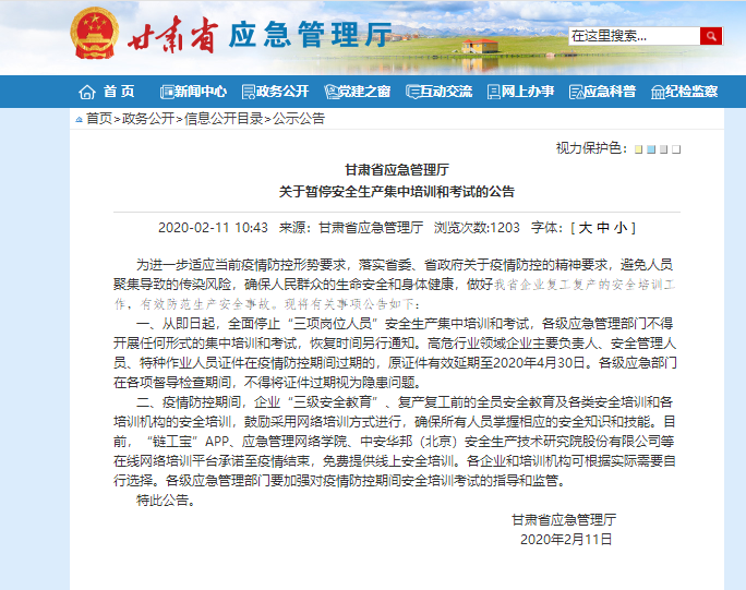為全面落實疫情防控和安全培訓工作要求,蘭州新區化學工程有限公司培訓中心結合疫情防控和復產復工實際,根據甘肅省應急管理廳2月11日發布的《關于暫停安全生產集中培訓和考試的公告》相關要求,在疫情期間免費為新區企業提供線上復工復產專題安全培訓。