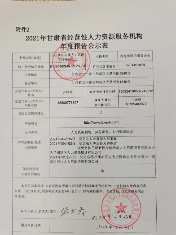 根據(jù)甘肅省人力資源和社會(huì)保障廳《關(guān)于開展2021年度全省經(jīng)營(yíng)性人力資源服務(wù)機(jī)構(gòu)年度報(bào)告公示工作的通知》(甘人社通〔2022〕44號(hào))文件要求,現(xiàn)對(duì)蘭州新區(qū)石化人力資源培訓(xùn)有限公司2021年度報(bào)告進(jìn)行公示,接受社會(huì)監(jiān)督。詳見年度報(bào)告公示表。