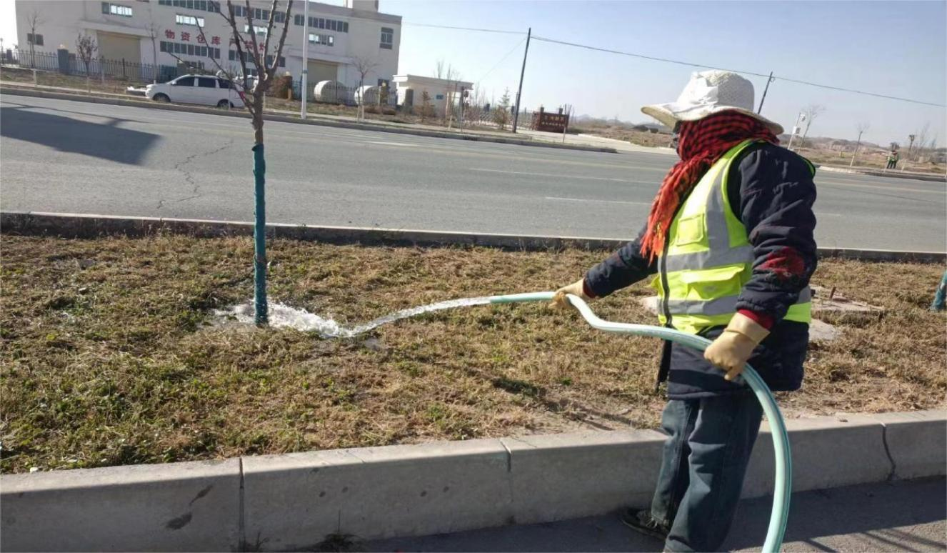 冬灌采用水車澆灌、人工澆灌、噴灌等多種形式確保水分充分滲透到土壤中。同時,加大巡查力度,采取實地抽樣檢查冬灌滲水深度,對澆灌不徹底和過度灌溉的綠地要求立即進行整改,確保每塊綠地澆灌徹底,使苗木吸收到充足水分,對新栽植的苗木結合封凍水在樹木根部培起土堆加強其保溫、保濕效果,目前冬灌正在有序進行中。